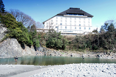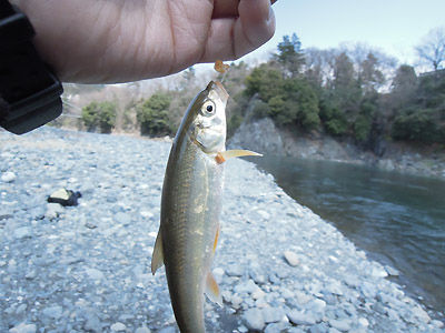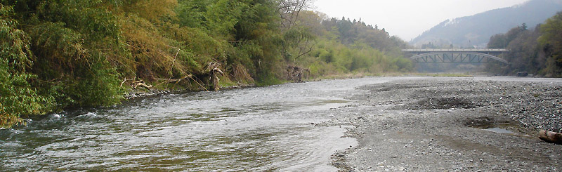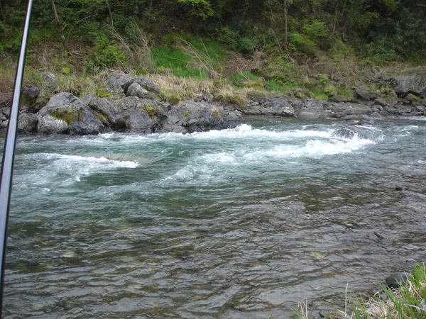 移動する前に鮎美橋直下の岩に仕掛けを入れたが、砂利が流されて来たのか浅くなってポイントは消えていた。どんどん下り、下流の大淵までくると、流れは強いものの以前より渓相が良くなっていた。しかし、先述の護岸を沿う様に流れて来た強い流れは、今までの光景を嘘の様に無くしていた。以前は二本の流れが同じくらいの幅で流れていたが、右岸側が本流になっていた。