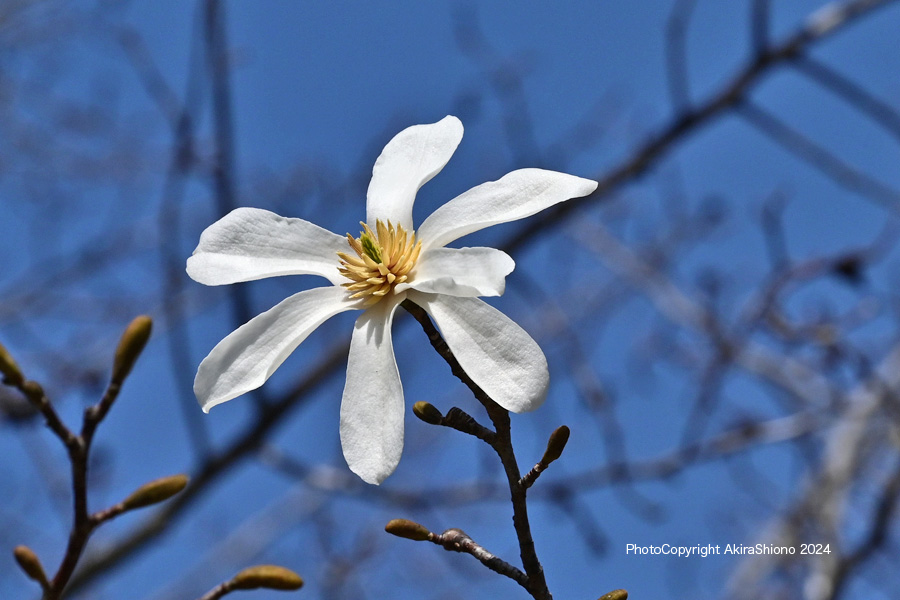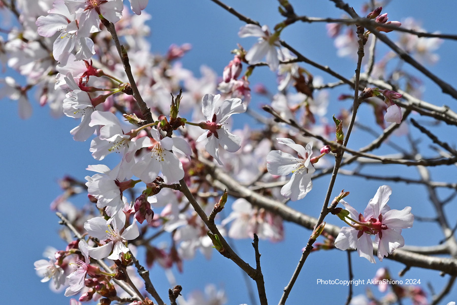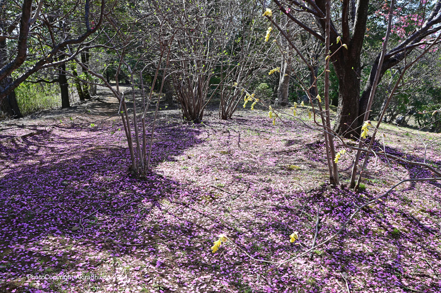 いつもこの公園には、南側の西立川口から入りますが、今回は日本庭園に近い拝島口からの入園となりました。園内に入ると目を引いたのは「ハナモモ」の濃いピンクの花でした。場所によっては既に地面に散ってピンクの絨毯の様に覆われていました。さくら待望の桜の開花はまだ早かった様で、所々で花が咲いているという状況です。しかし初春の花の代名詞の「コブシ」の白くて大きな花びらが青空に映えていました。