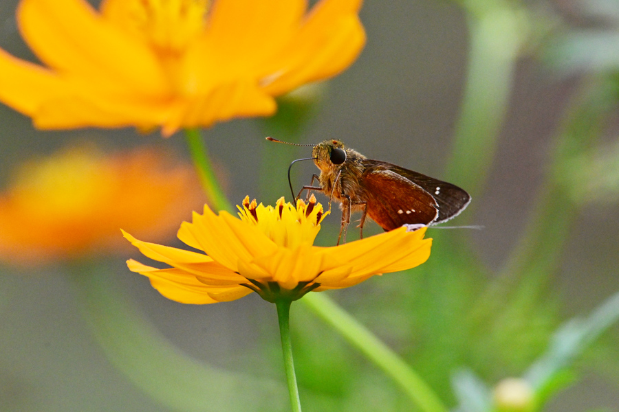 キバナコスモスの蜜を吸いに来た、チャセセリチョウとホシホウジャク