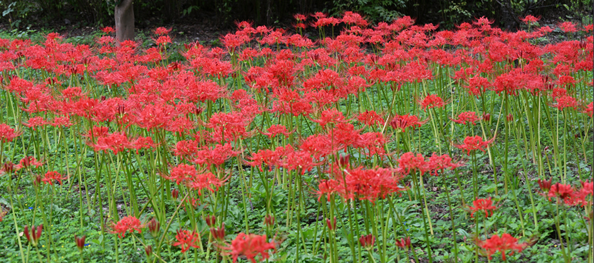 道端でこの時期によく見かける彼岸花(曼珠沙華)ですが、園内では、所狭しと咲く真紅の花々を見る事が出来ます。