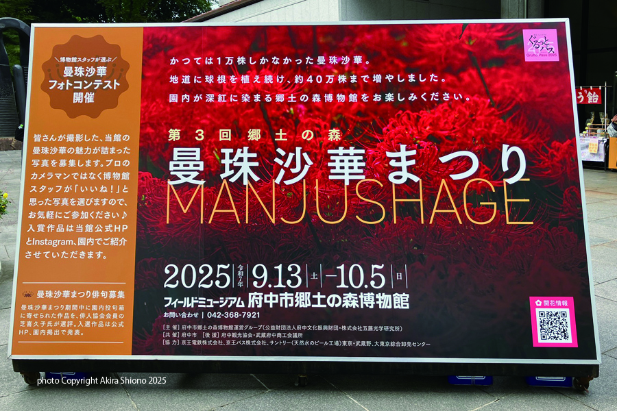 ここ府中市の郷土の森は春は「梅まつり」初夏は「あじさいまつり」で人々を楽しませてくれますが、9月下旬になると「曼珠沙華まつり」が開催されます。博物館前の看板には、「かつtrは一万株しかなかった曼珠沙華。