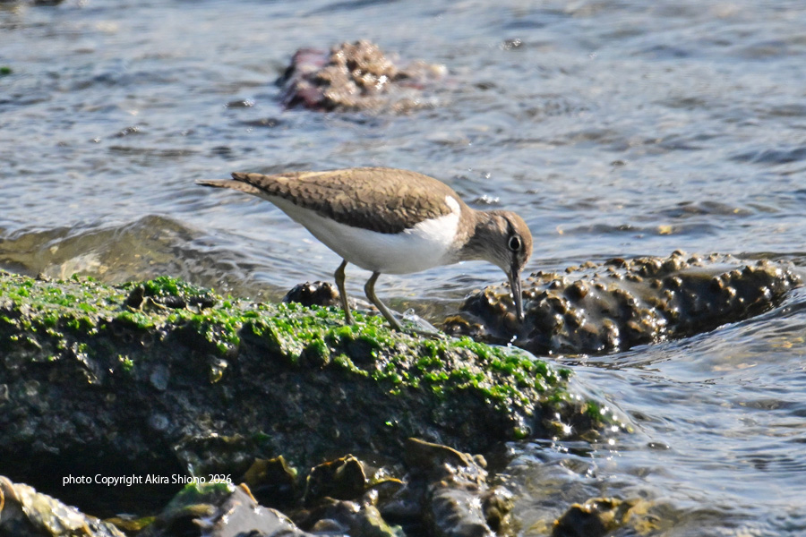 磯場で餌を探すイソシギ、コガモのペア、ホシハジロ