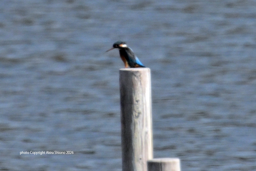 オナガガモ、100m先の木の杭に留まるカワセミ、磯場にやって来たオオバン
