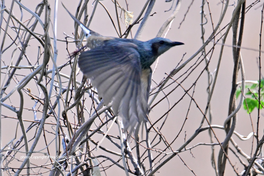入り組んだ小枝から飛び立つヒヨドリ、航路灯に留まるカワウ、干潟に顔を出したガニ