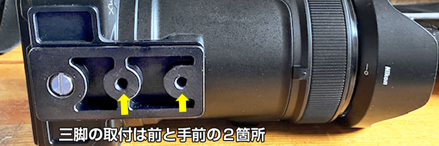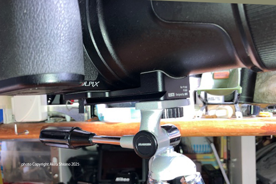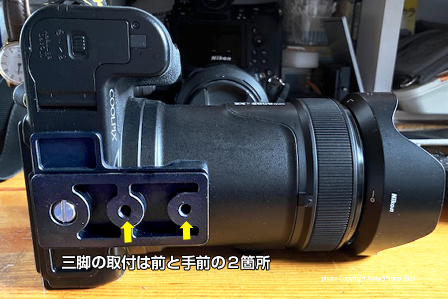 このCOOLPIX P1100の三脚ネジ穴は一般のカメラのようにボディ下にあります。実はこのCOOLPIX P1100の重心は、レンズ側のフラッシュの付け根のヒンジあたりにあります。この部分はズームレンズの下あたりなので構造上と強度的な問題から、ここには三脚のネジ穴を取り付けることができなかったと思われます。 三脚アダプター装着で三脚撮影 トップへ