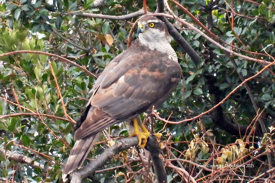 対岸の枯れ木の枝でミサゴの獲物を隙あらばと狙うオオタカ 撮影:NIKON COOLPIX P1100 3000mm相当 三脚撮影の必需品:LIM'S TripodPlate トップへ
