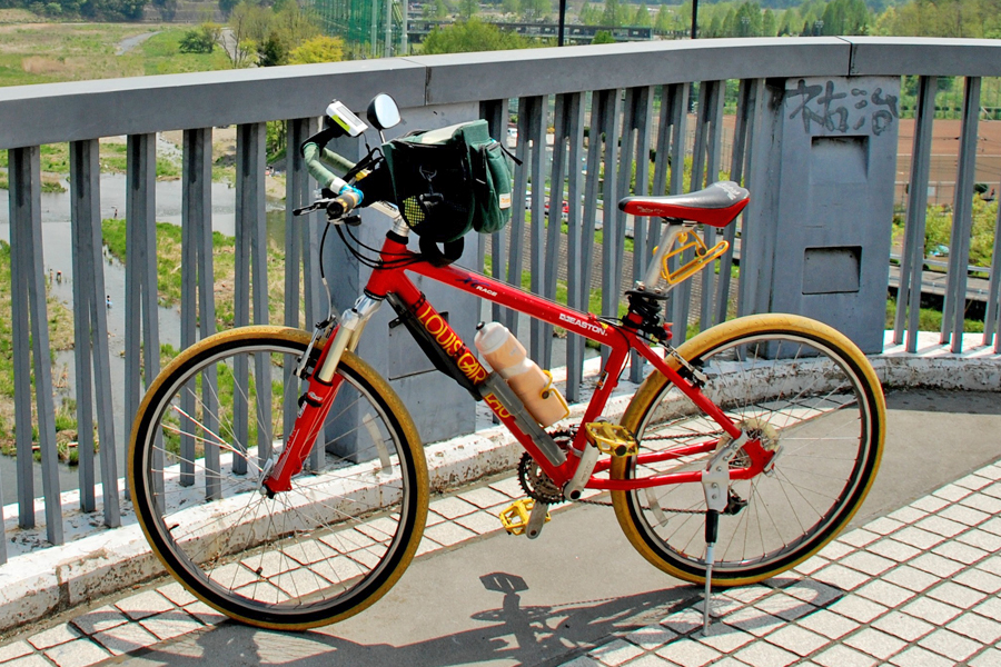 ![]() 上の写真のマウンテンバイクに標準装備の悪路用ブロックタイヤ 26x1.50のスリックタイヤでもこちらは張り出しているので広く見えます