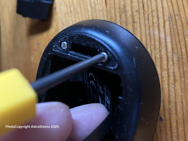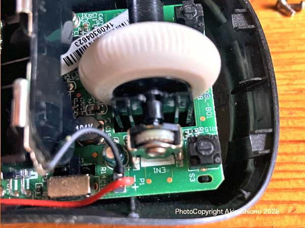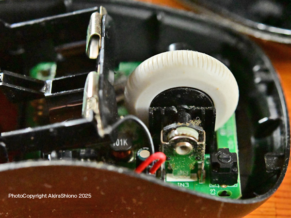 これが反応が悪くなったホイールです。見る限りセンサーはホイール軸の右(上)端にある様です。下の画像はその部分を拡大したものです。ホイールを回してもスクロールしない状況は軸あたりに問題があると思えます。 ![]() 取り付けは3本のビスのみ マウスのホール部分