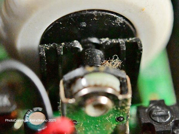 ![]() よく見るとホイールの軸部分に綿ぼこりが絡まっています。