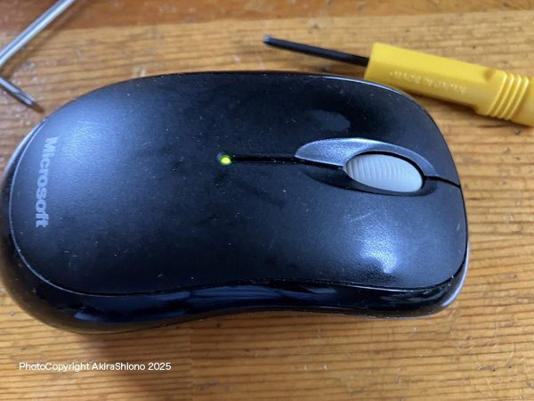 このマウスはキーボードとセットになっていたマイクロソフトのワイヤレスマウス1000で、WINDOWS7時代頃のものだったと思います。意外と頑丈なので現在のWINDOWS11で使っていますが、ブラウザをスクルロールしようと思っても空回りしてほとんどスクロースしなくなっていました。 マウス分解に使う工具 トップへ マウス掃除に必要なものは、一般家庭にあるものですみます。左の画像は、ドライバーセット、マイクロドライバー、掃除ブラシとマウスです。 ここで分解するマウスは、作の細い#1のドライバーが必要でした。隣のマイクロドライバーは、細かい箇所にこびり付いた汚れを削り取る時に便利です。その隣は直径15mm程の穂先のナイロンブラシで、狭い場所にある埃を掃き出すのに便利します。この他に綿棒があると汚れを拭い取ることができるので、さらに綺麗にすることができます。 マウスの分解手順 トップへ このMicrosoftWireleaaMouse1000の分解は、底にある電池カバーを開けた電池室の奥にあるネジを外すことから始まります。しかこのネジは奥まっていてよく見えませんでしたが、どうやらトルクスのようでした。手持ちのレンチを当てて見ると、T9がピッタリ合いました。 マウスカバーの取り外しと内部の画像 トップへ