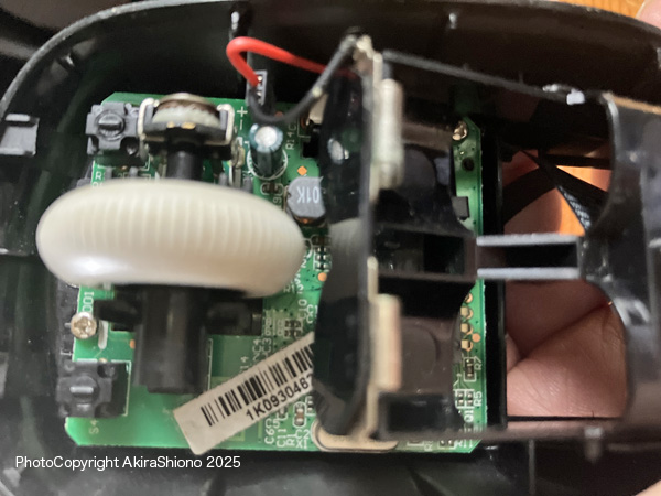 このMAマウスは上記の様に2種類、計3本のネジで留められていました。 マウス内の構造と綿ボコリの除去 トップへ