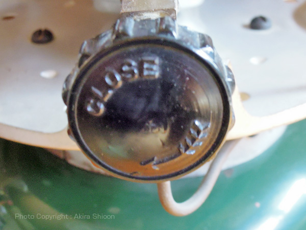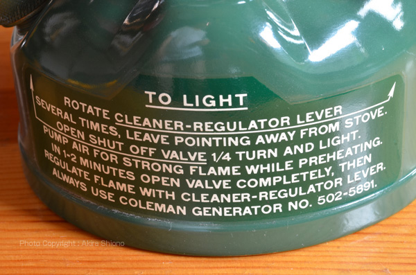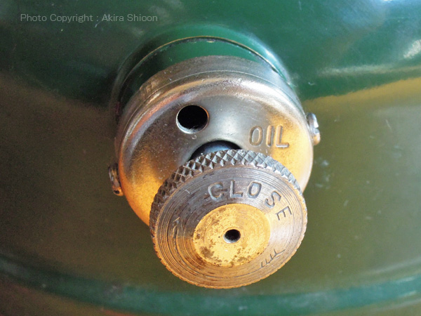 ![]() Coleman502以降の製品よりかなり小型の燃料キャップとポンプレバーでネジ2本で留められています。 Coleman 502 U.S.A '68 トップへ