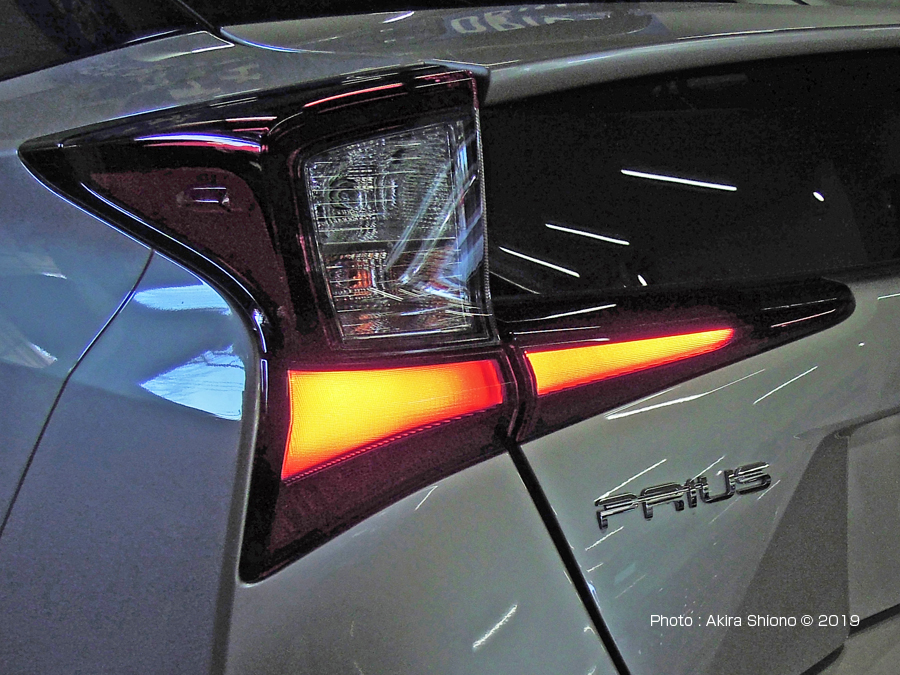 19年型のプリウスのデザインの大きく変わった箇所は、リアスタイルです。リアランプ周りは縦長のリアランプが採用されていました。真後ろからみるとそんなに悪く感じませんが、斜め後ろからみると今一に感じます。ボディ側面から後ろに流れるプレスラインの延長で、リアランプの凸凹デデザインが・・・どうなんでしょう?というザインでした。 ![]() 19年型プリウスの後ろ姿で、夜のポジションランプが高級感のあるキメの細かいLEDランプになりました。