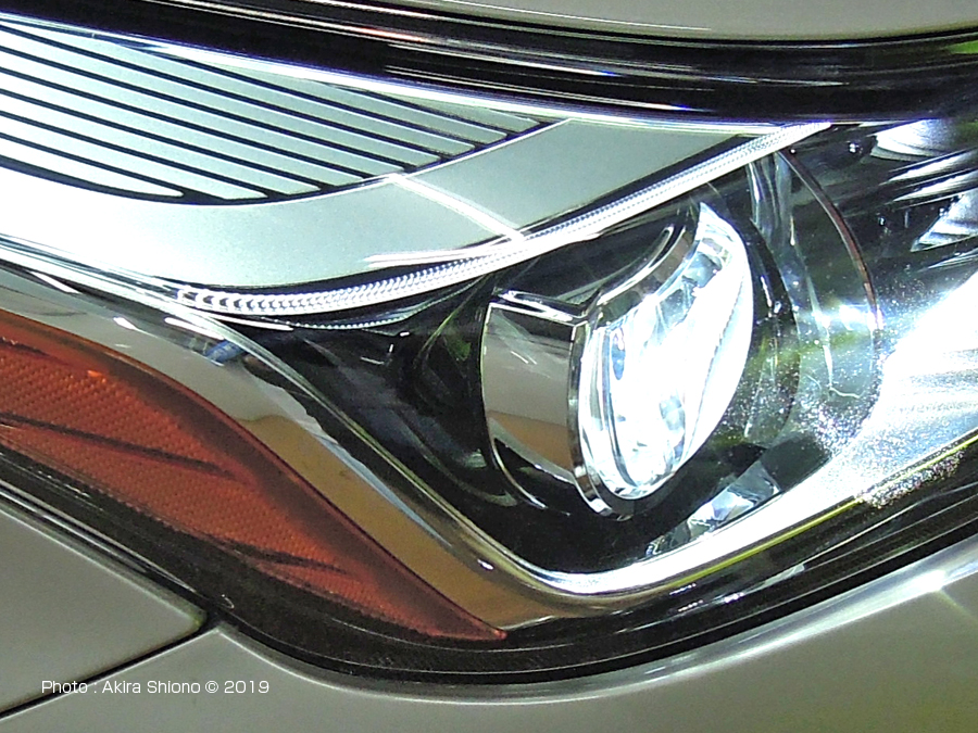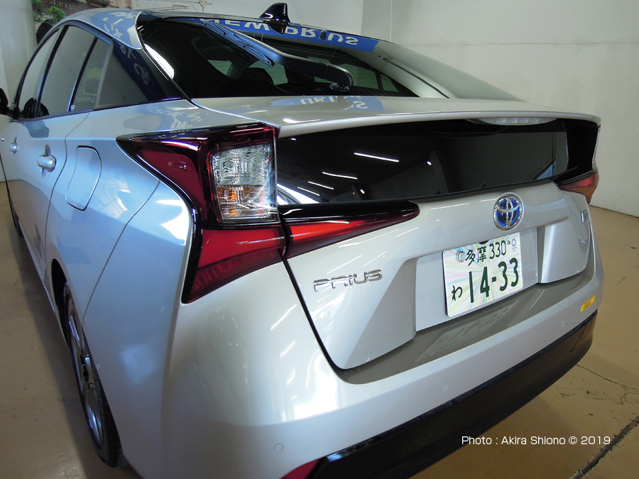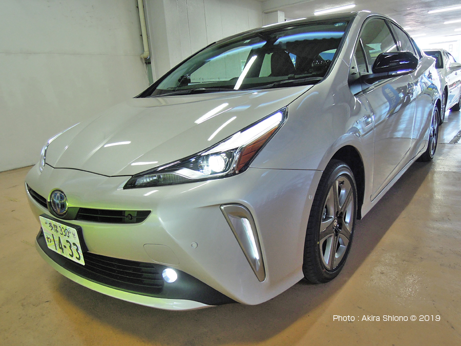 2019Priusの店頭発表から数日後に、ナンバーがついた同車体が試乗車になりなした。グレードは最上級のツーリングモデルのAプレミアムツーリングです。ツーリングとノーマルタイプと違いは、フロントでは上の写真にあります様に「ボジションライト」でリアでは、「バンパーがピアノブラック塗装」です。またグレードによって、Aグレード以上にはフロント下部にLEDフォグランプや、雨滴感応式ワイパー、ブラインドスポットモニター、シンプルインテリジェントパーキングアシスト、カラーヘッドアップディスプレー、乗車時のフロント足元照明、運転席8ウェイパワーシート、電動ランバーサポート、ピアノブラックのフロントコンソールトレイ等となっています。 大きく変わったフロントfまわり (2019.1記述) トップへ