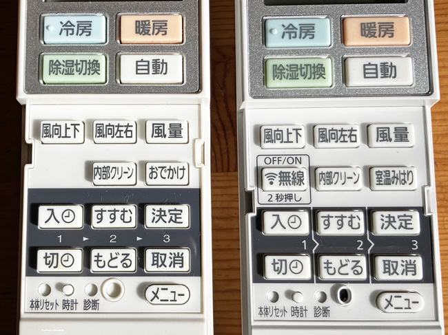 新旧リモコン比較 トップへ 12年前のリモコンは、設定温度が1℃単位しかできませんでしたが、今回のエオリアのリモコンは数年前から0.5℃単位の調整が可能です。新旧を比べて見ると「においケア」「おでかけ」のボタンが、下部の蓋をあけると無線ボタンが追加されています。他は基本的に同じです。 新旧室外機比較 トップへ
