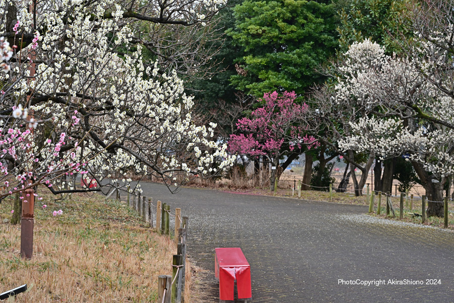 先週に続き梅の開花状況を観に雨上がりの郷土の森公園へやってきました。この公園では毎年2月上旬から3月上旬まで「梅まつり」が開催されています。今年は2月3日~3月3日の約一ヶ月間行われます。梅まつりと詠うだけあって、多摩川に近い園内の南側には梅園が広がっています。1週間前に訪れた梅園の枝垂れ梅は黄緑色の枝でしたが、この7日間で枝野蕾はかなり開いていました。梅まつり開催の時期に合わせるよう梅園の所々に紅白の梅の花が目立つようになってきました。