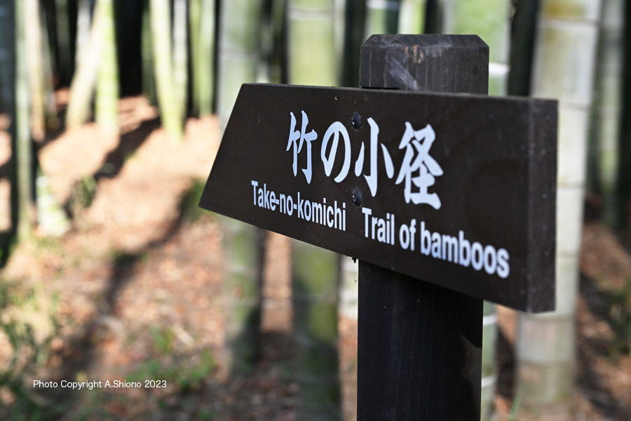国分寺駅南口近くの「都立殿ヶ谷戸庭園」内の紅葉亭わきの「鹿おどし」と東端の崖線下の竹の小径