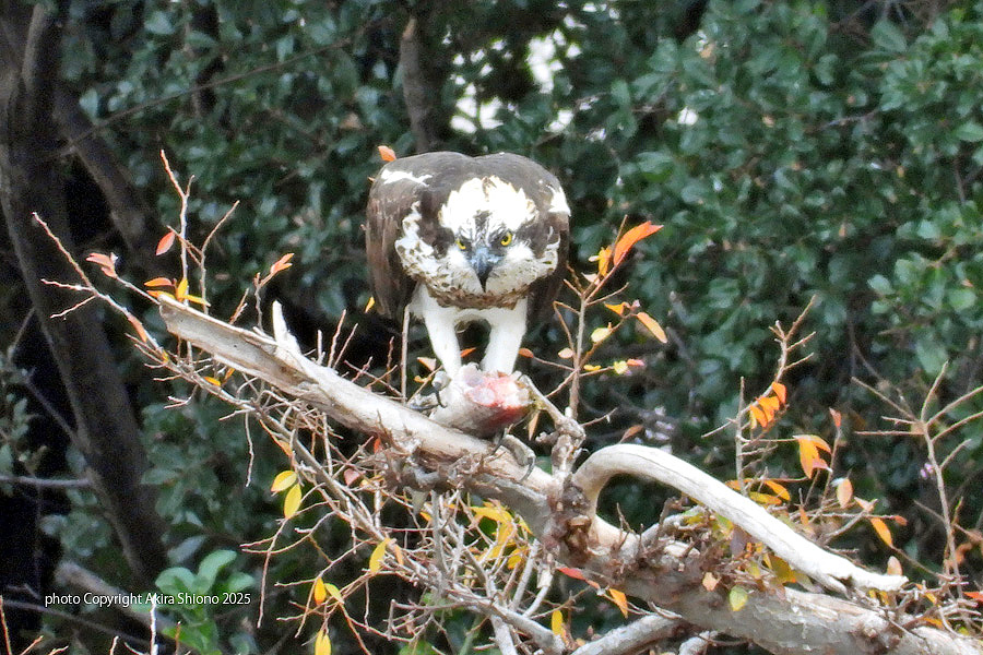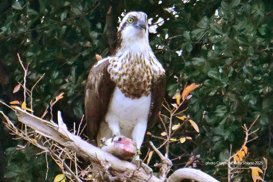 今回は、ミサゴに会うことができました。この周辺はトビやノスリ、ハイタカが居て獲物を引っ手繰られる事があります。その為かこの時は獲物を鉤爪で押さえながら、上空を警戒していました。実際この木の上の方にオオタカがミサゴが捕まえた魚を狙っていました。