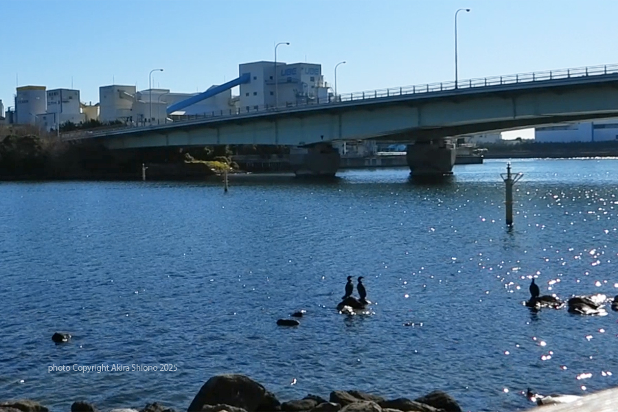 上空で餌探しをするトビ 城南大橋の手前にはカワウ