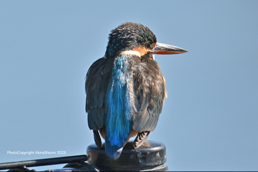 池に囲まれた「観察小屋の脇の干上がった池の間から久々のコサギが目の前を通り過ぎ先の柵に留まりました。