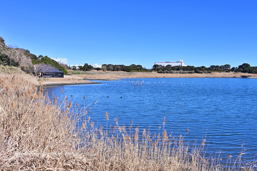 この所ほとんど雨が降らず、乾燥の日々が続いています。天気図の等圧線がまるできたから南へ伸び、滑り台の様に極寒のシベリアから日本列島へ寒気を運んでいます。そのお陰で雪は本州北部の山地に堰き止められますが、水分を失った乾いた寒気が吹きすさんでいます。このせいか池にいたカモ類は、葦の隙間に隠れたり水中から出ています。