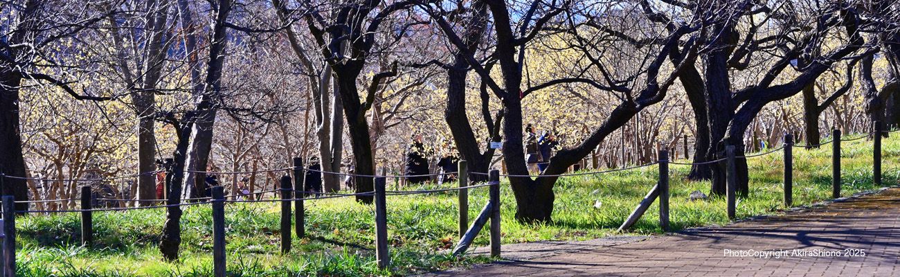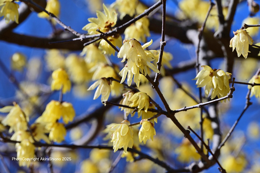東京都の府中市にある郷土の森博物館(野外博物館)では1月を過ぎるとロウバイの花が咲き出して、次に梅園の花が咲き始めます。梅まつりが毎年2月第1週から3月上旬まで開催され園内には梅の花々と梅の香りで満されます。この時期に梅園が本来の人出で賑わいますが、その前に薄黄色の花びらをロウに浸けた様な透明感のある花びらがロウバイ園いっぱいに咲き乱れます。