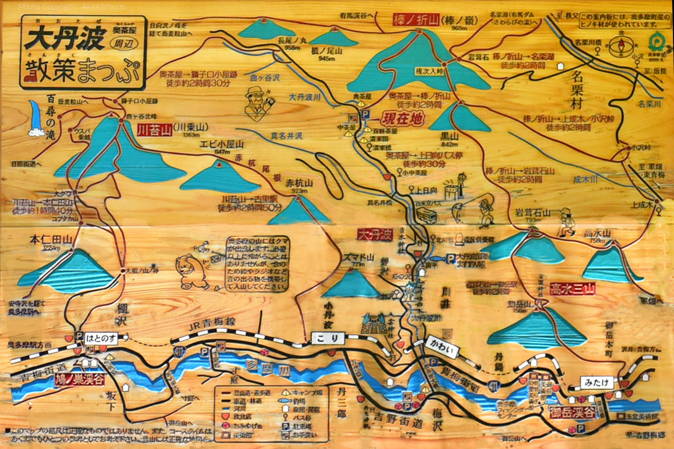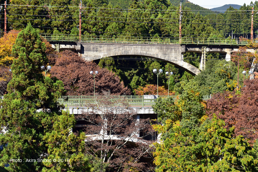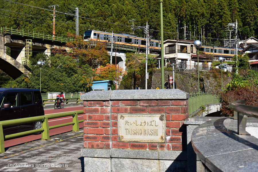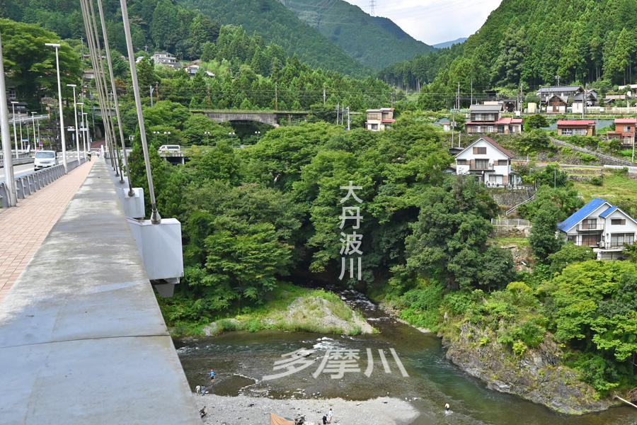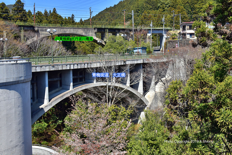 上の画像は、青梅線が通る大丹波橋梁(正面奥)、青梅街道の大正橋(正面右)、吉野街道を繋ぐ奥多摩大橋(左端)です。奥の大丹波川橋梁の右延長線上には、青梅線の川井駅があります。ホームからは多摩川に架かる斜張橋の「奥多摩大橋」の全貌が見えます。 |