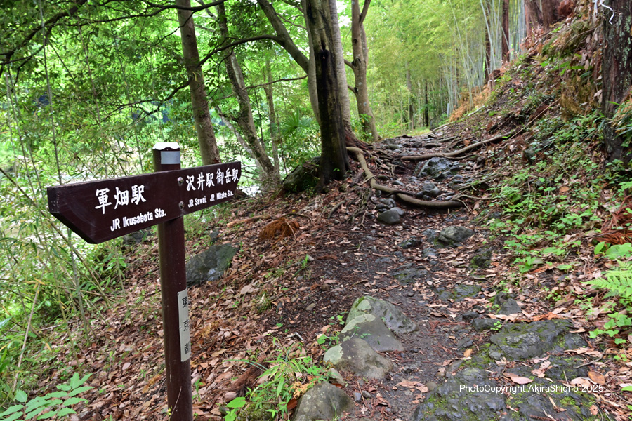 ここ軍畑大橋からは、天気が良いと遠く御嶽山頂が見えますが、この日は曇りがちで一時現れていましたがすぐに隠れてしまいました。 この近くには、「御岳渓谷遊歩道の入口」が青梅街道沿いの西700mの位置にあります。この遊歩道は、奥多摩町に近い「せせらぎの里美術館」近くまで繋がる約4kmの川沿いの遊歩道です。入口から急な降りの石段が続きますので足元には要注意です。この遊歩道は一部に安全の為に舗装されている箇所がありますが、基本的に砕けた岩や露出した岩盤と湿った地面です。足元が悪いので年配の方には要注意です。