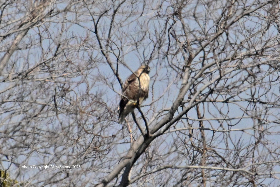 逆さに留まって餌を探すメジロ、枯れ枝に留まるムクドリ、200m程先の枯れ枝に留まるノスリ 撮影:NIKON COOLPIX P1100 200mm |