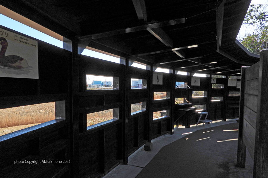 上の画像は、東観察広場の窓枠が沢山空いた監査用建物です。現在はここから見える場所には水で満たされていて秋からの季節では、カモ類が観察できていましたが、この「東淡水池」埋立地に造られたエリアで湧き水が出ないので、雨が一定量降らないとこの様なヒビ割れた池底が顕になります。