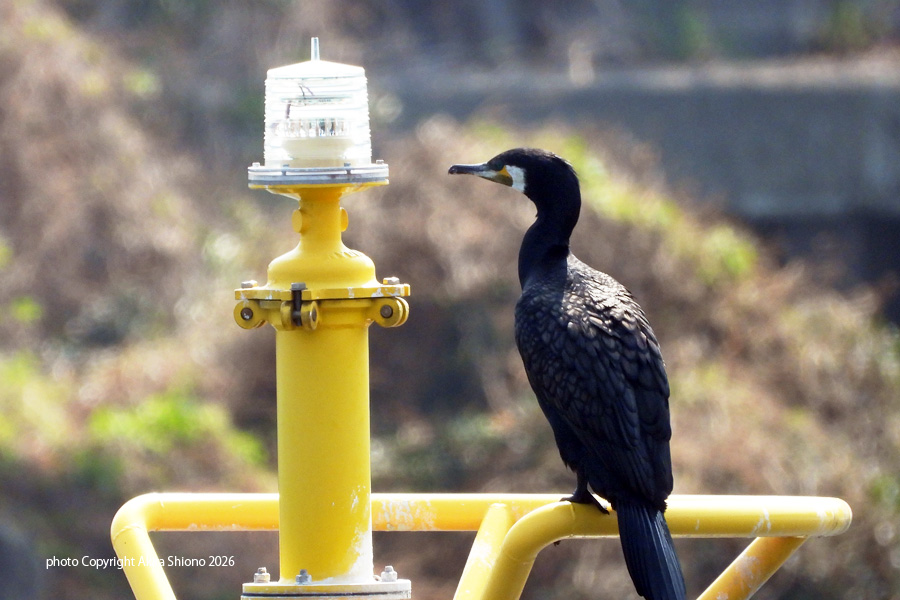 入り組んだ小枝から飛び立つヒヨドリ、航路灯に留まるカワウ、干潟に顔を出したガニ