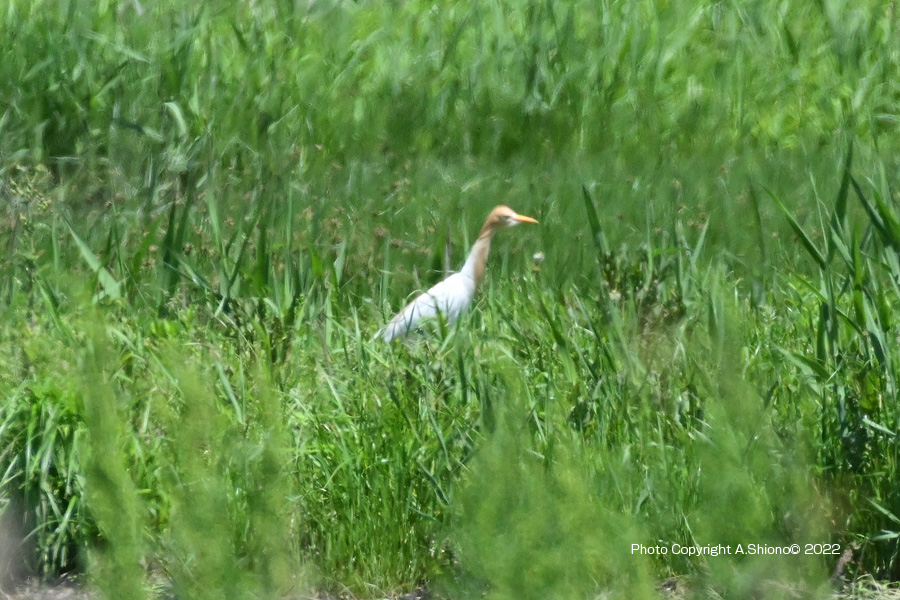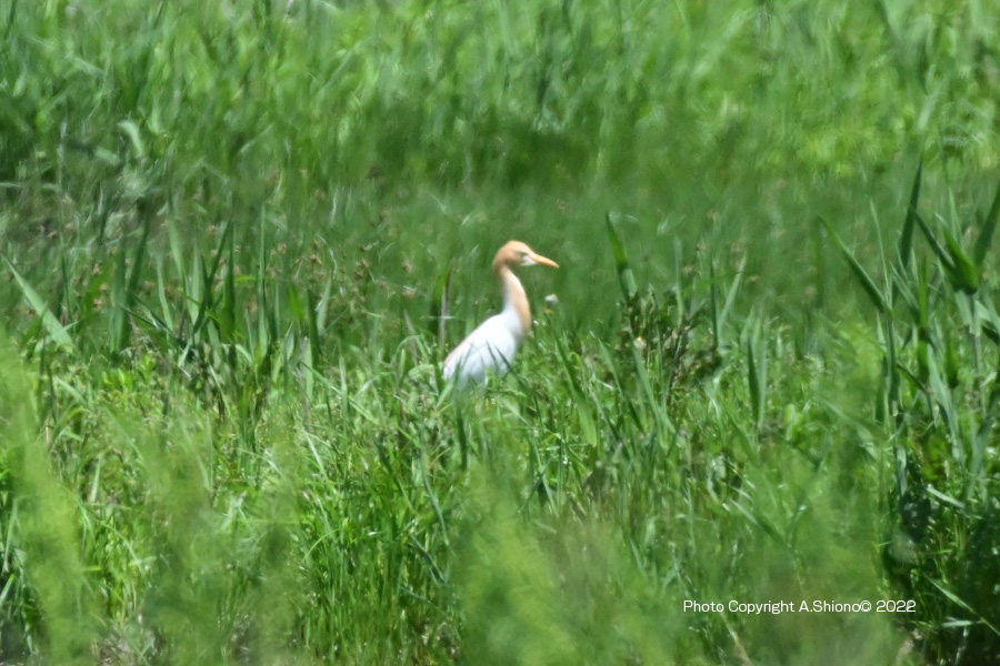 アマサギは、サギ類の中でも一番小型のものは「コサギ」ですが、全長が約50cmと小型でクチバシは短かめでなサギです。生息場所は、草はら、水田、湿地、沼地で、カエルやドジョウなどの小魚、水生昆虫などを捕食します。アマサギは夏鳥で、夏の繁殖期になると東部から胸部にかけて薄めのオレンジ色に変色します。この色は一般に「亜麻色」と呼ばれているので、アマサギを呼ばれていますが、繁殖期以外は体色は白になります。 4月下旬:遠くの草はらで移動するアマサギ 2022.04.30 トップへ