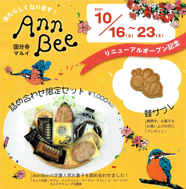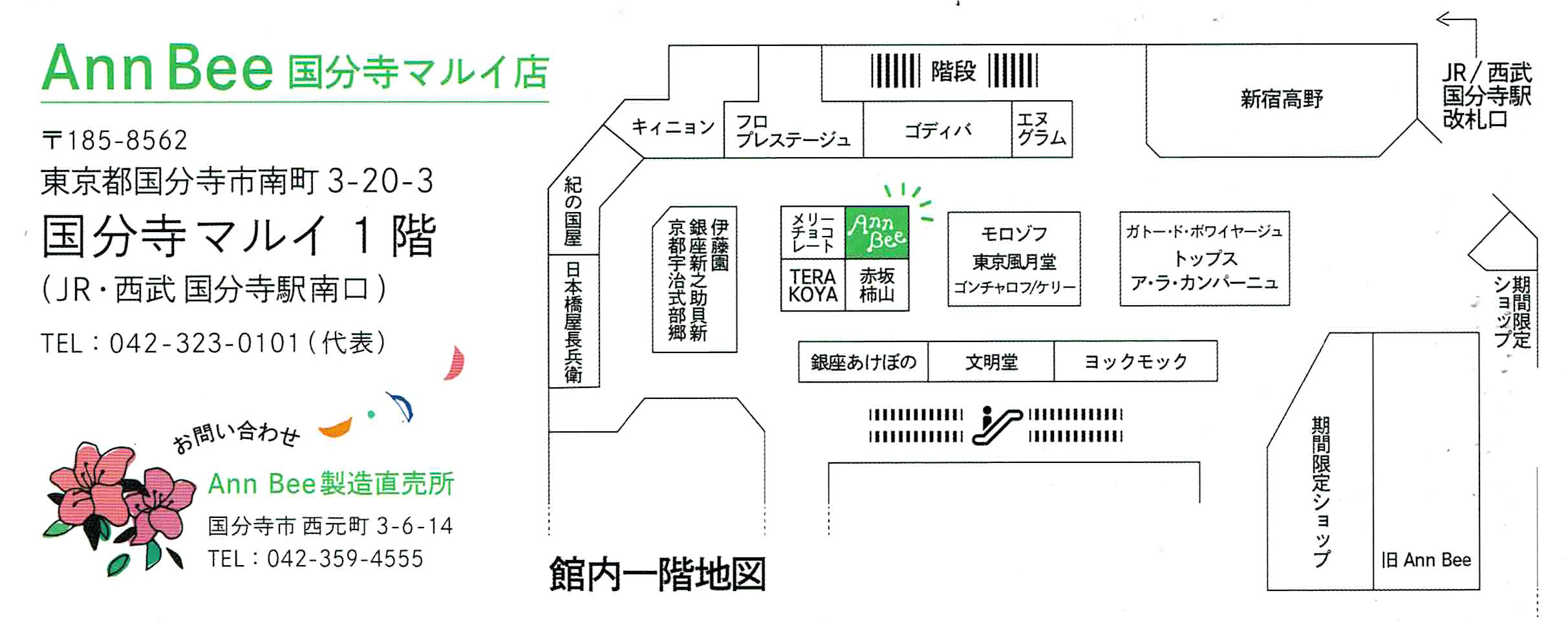 フィナンシェ、焼きドーナツや「こくべじ」を使ったお菓子を詰め合わせた「天平宝字」¥5,500が載っています。 AnnBee 西元町製造販売所 2022.8.24 トップへ AnnBee 西元町製造販売所に大きな垂れ幕がかかりました。こちらで製造したお菓子類を販売していますので、こちらを目印にお越しください。場所の目印はフォルクスワーゲン国分寺の北隣です。右の地図からご覧になれます。 国分寺駅ビル1F店舗 売場移動しました 2021.10.15 トップへ 国分寺ブランド認定 トップへ