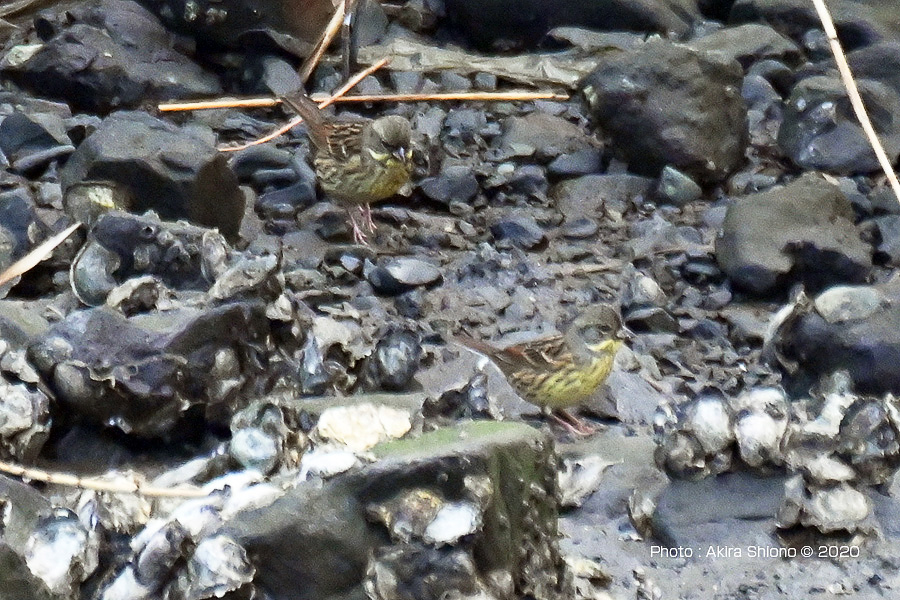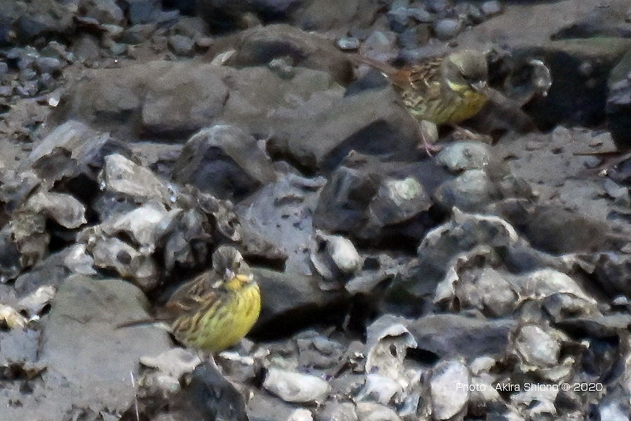 同じく芝生にいる昆虫などを探すアオジでホオジロと違い腹部は白い 撮影:NIKON D500+TAMRON SP150-600mm f5-6.3 手持ち撮影 12月中旬:40m先の対岸の約16cmのアオジ 細長い池の対岸で16cmほどのアオジを見つけました。距離は約40mあり肉眼では判別できませんでした。結局はコントラストの薄い日陰の環境でした。レンズは最長のテレコン2.0x+APC-Cの1.5倍モードで1500mm相当となりました。被写体が小さいので、トリミングでさらに荒れていまいました。 ![]() 1500mmで40m先の対岸にやってきたアオジのペア。左下の画像の一部を拡大したもので、鳥は黄丸の位置。