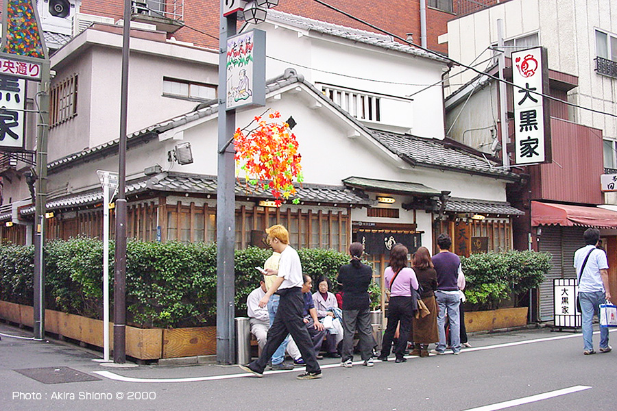〔大黒家天婦羅HPから〕 大黒家といえば天丼。 ご飯が見えないくらい大きくどん ぶりからはみ出た海老天丼が人気です。 ごま油だけを使って、キツネ色に揚げた天ぷら。 ちょっと辛めで濃厚なタレは一度食べたら忘れられない 懐かしい味がします。 大黒家天麩羅は明治二十年(1887)、浅草 伝法院通りに、そば屋としてはじまりました。現在の本店所在地と同じ伝法院通りは、人通りが多く、賑やかで繁盛してはいたものの、忙しい割には儲かりませんでした。でも天ぷらそばがたくさん出た日には売り上げが上がります。そこで明治の末にそば屋から天ぷら屋になりました。屋号が「大黒屋」から『大黒家』に変わり店主は四代目となった今も、昔の味をずっと守り続けています。 大黒家天婦羅HPはこちら