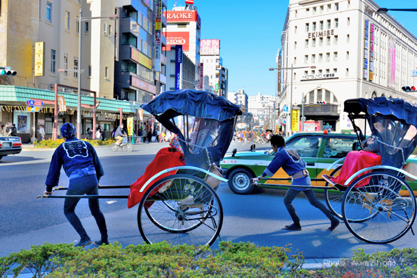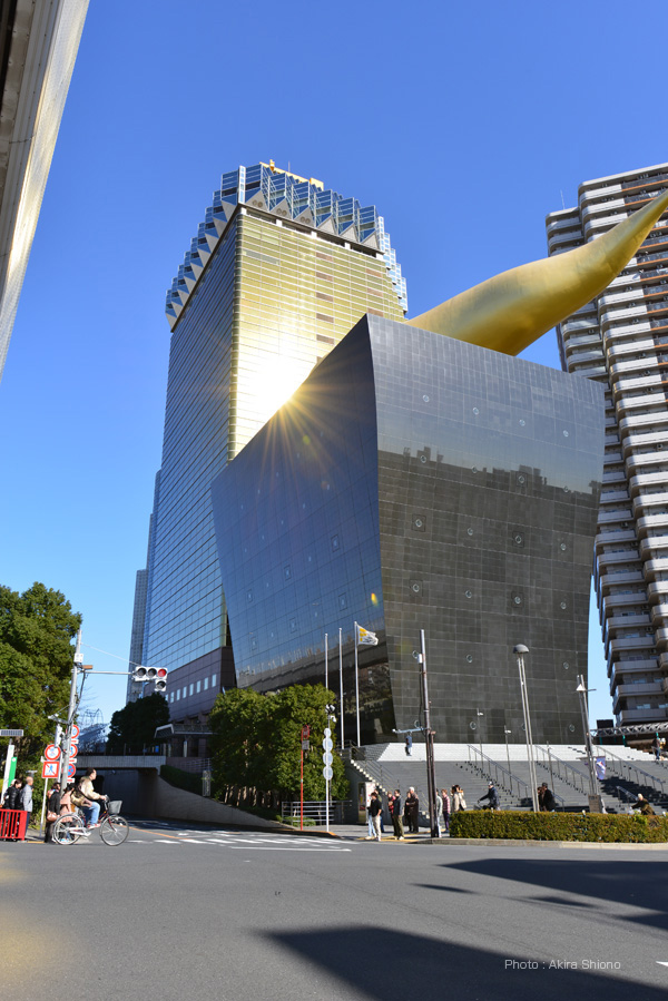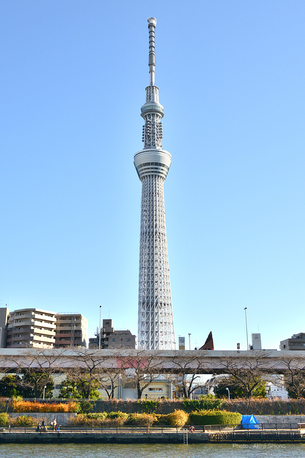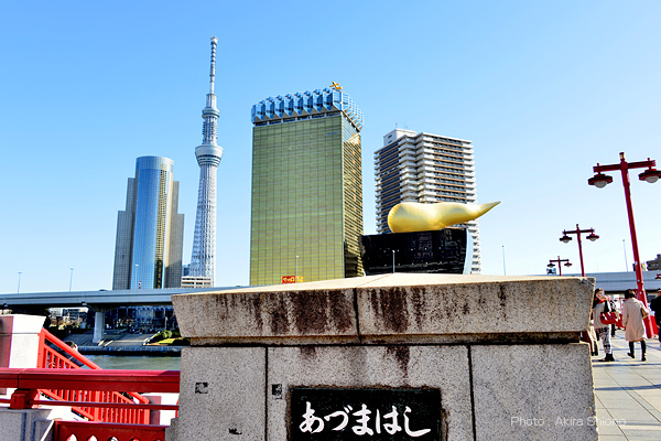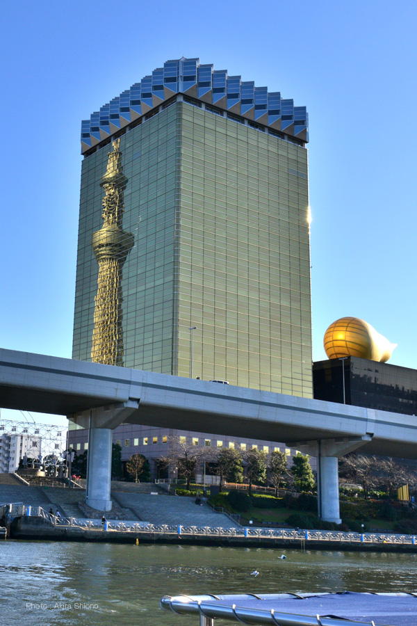 H24の12月中旬に、浅草までいって東京スカイツリーでも見に行こうと出掛けました。我が地元でも冬の空気の澄んだ真冬に奇麗に見えます。この時期でも押上の東京スカイツリー駅までいってもまだ人があふれていると思い、この日は吾妻橋と浅草方面を行くことにしました。 電車を浅草で降り、比較的見通しが良い吾妻橋から眺めることにしました。さすがにスカイツリーが出来たせいか、人が道にあふれていました。ここはアサヒビールのアートスクエアーの “きんと雲” のようなオブジェがのっているこのビルは、この場のランドーマークになっています。橋を渡って近くで撮影してきました。 左ー浅草駅前で走る人力車 右ー吾妻橋から見る東京スカイツリー。