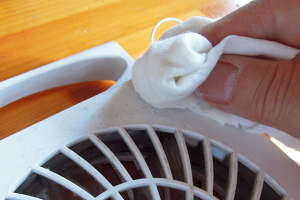 写真のUSBファンは何故だか片面に滑り止め加工されていました。最初はゴムのような感触で高級感も多少あり、良かったのですが、時間経過とともに表面がベタベタになってしまいました。触るのも気持ちのよい物ではありませんし、ホコリもベタベタに付いて黒くなり汚くなってきました。本体は全く問題なく作動するので、清掃してみることにしました。まずは、機械部品をキレイにする「パーツクルーナー」でやってみました。油汚れには協力な洗浄力が有りますが、こちらには全く変化が有りませんでした。 表面の肌触りをサラリとさせる トップへ この消毒用アルコール(他のものでも大丈夫です)を、布に染み込ませてこれで拭くきます。布の種類は柔らかい、使用済みの肌着の布(ティッシュなどはボロボロになります)で、いくつかに切っておきます。このアルコールはベタベタを溶かす作用があるようで、段々元の地が出てきます。剥がれたベタベタは溶けずに布に細かく残りますので、布を使い切ったら新しい布にアルコールを染み込ませどんどん拭いていきます。