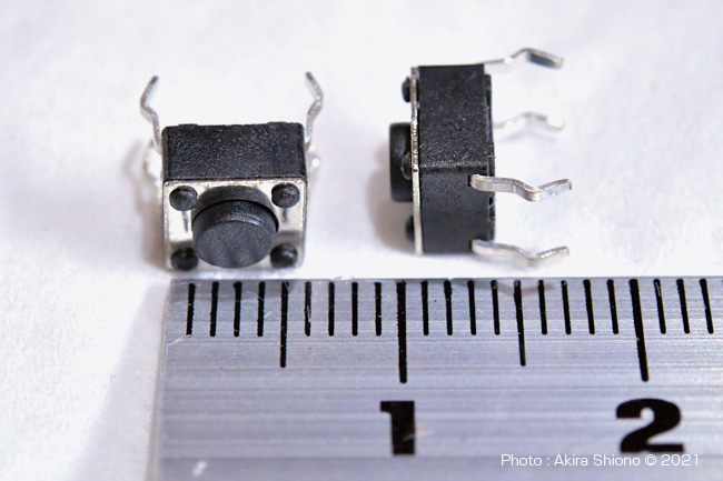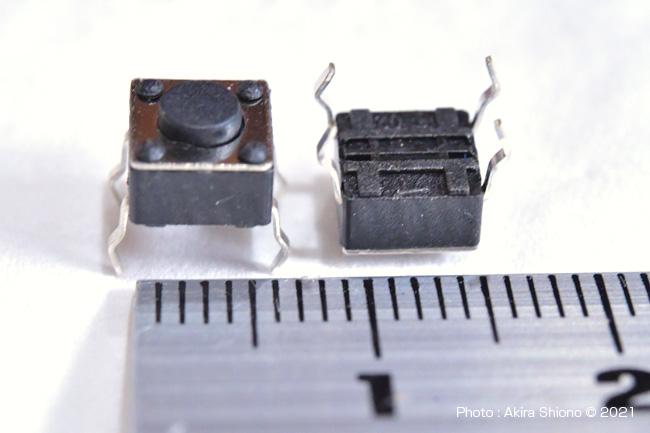 電気製品のプッシュスイッチ(タッチタイプ)に良く使われているのが「タクトスイッチ」です。良く見るとこのスイッチには4本の脚がありますが、脚の開きが違っていますので、交換時に迷うことがない様にしてあります。