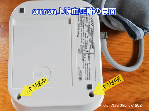 この上腕式電子血圧計の場合は、左の画像のように裏返しにすると黄色の矢印の場所に穴があり、奥にビスが隠れています。しかしこれを緩めて外しても、上下はウンともスンともいいません。