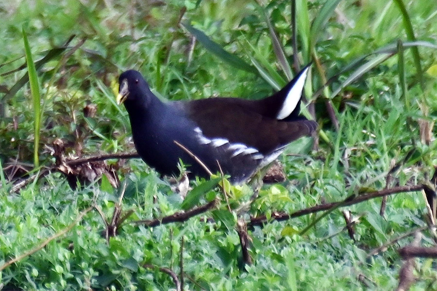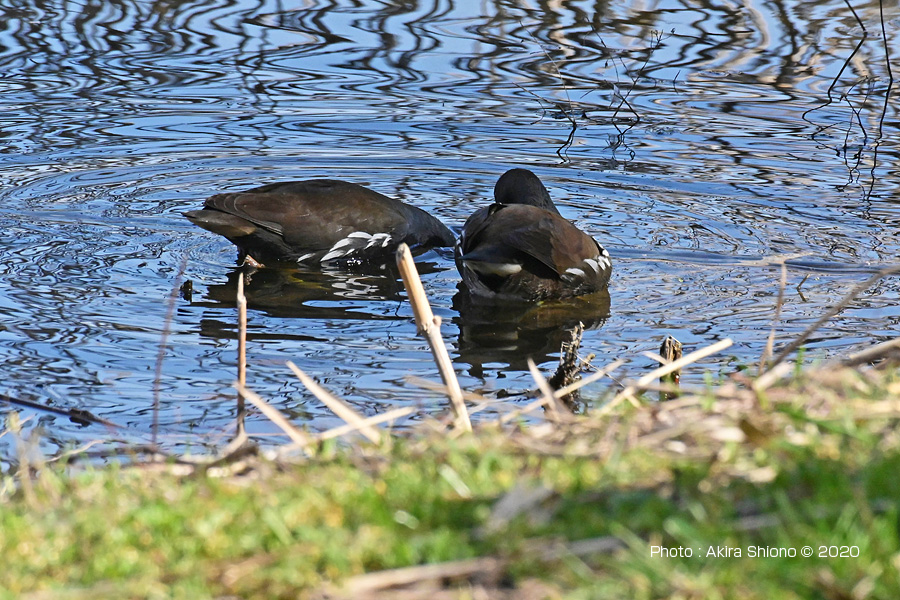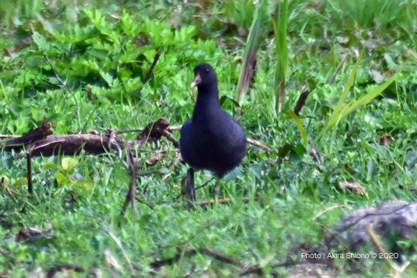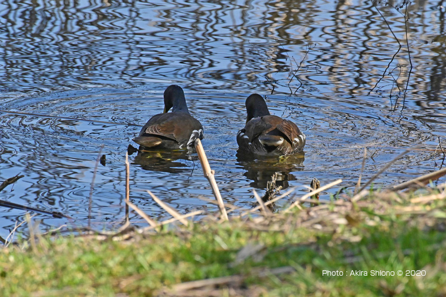 観察施設の側で見かけるバンは水辺に向かっていることが多く、比較的後ろ姿が多く撮影していました。今回、東淡水池から潮入の池に流れ込む水路の小高い岸で数羽が餌を探しながら休んでいる姿を見つけることができました。 水辺のバン トップへ