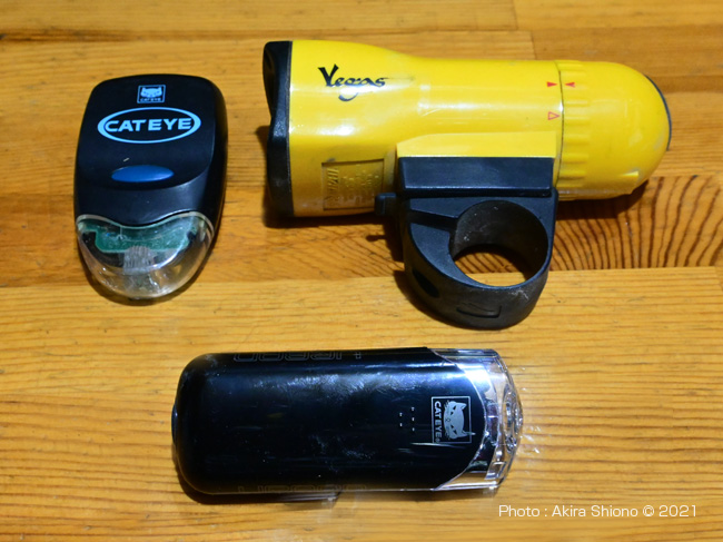 そのうち消耗品の電池交換の煩わしさから、タイヤの回転を利用して発電する発電ランプが発売されこれがかなり普及しました。しかし当時のダイナモランプは、接触部分のローラーが円筒に縦溝を入れた直系の小さいもので、これでタイヤの回転を利用して発電するにはかなり抵抗がありました。そんなことからペダルが重くなるので、夜間に無灯火で走る自転車が増えました。その結果夜間に点灯していない自転車は相手から見えないので、接触事故も増えました。 乾電池用ライト トップへ 当初は電球タイプが殆どで、後に画像の黒いものがLED仕様のものです。現在は、省電力で明るいLEDタイプに置き換わってきました。