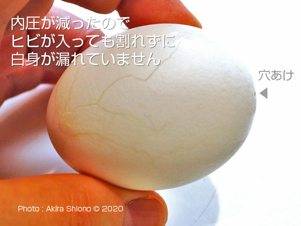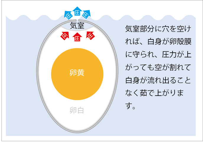 気室に小さな穴を空けて、割れない固ゆで玉子を作る