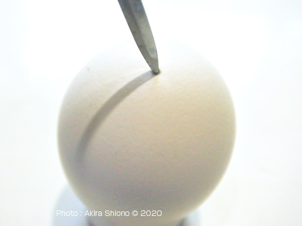 たまごには、尖っていない方(幾分丸い方)に気室があります。ここに小さな穴を空けることによって、綺麗に茹で上がると言うことでした。ただし、たまごの殻は少しの衝撃でヒビが入ります。こんなことあるものですから、穴あけには緊張してしまいます。たまごは縦方向には比較的強いと言われていますので、気室の側を上にして手でしっかりホールドして慎重に穴を空けます。穴空けに使ったのは、力のコントロールをし易いバーベキュー用のステンレス製の串を使いました。この串は先が剣のようになって鋭利なのと、平べったいので回転させながら穴あけするのに使いやすかったです。