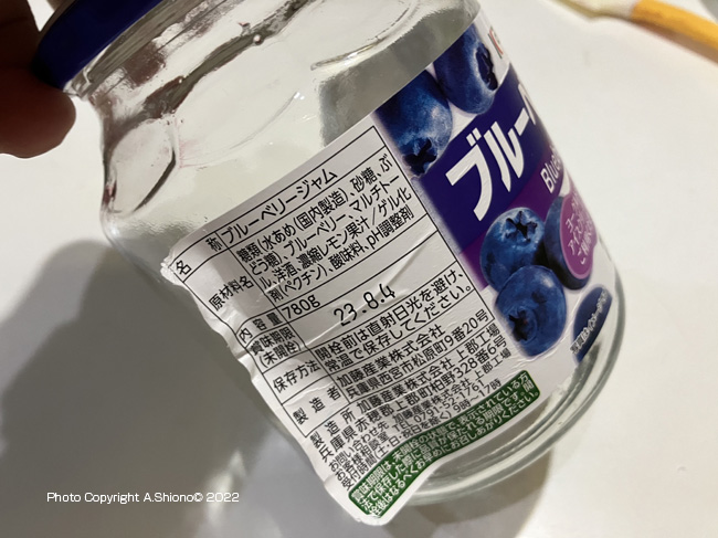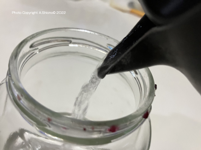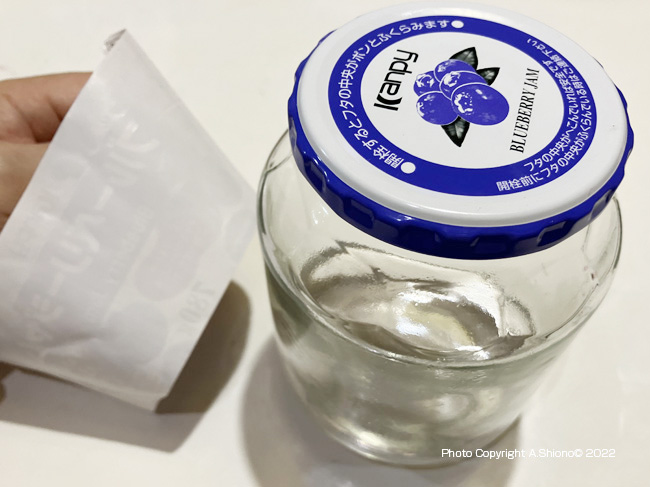 使う刃物はナイフでもいいのですが大きいものは危ないので、台所にあるキッチンバサミを用意します。普通のハサミでも切れ味が良ければ使えます。ハサミの切れ味が悪い場合は、別ページのハサミ研ぎをご覧ください。 空き瓶にお湯を入れ温めます トップへ さっと内部のジャムを拭い取って起きます。しかし、ラベルを濡らしてしまうとボロボロになってしまい後々除去が面倒になりますので、濡らさない状態で、瓶の中に沸騰したお湯よりも少し低めの熱いお湯を1/3程度入れて蓋をします。ラベルの位置にお湯が回るように瓶を傾けて熱が全体に行き渡るように瓶を回転させます。ラベルの辺りに触れてみて熱くなってからラベルを角から剥がします。温度で粘着が柔らかくなりますが、急いで剥がすと裂けてしまい後々面倒になりますのでゆっくりと行います。 粘着ラベルがカンタンに剥がれます トップへ 空き瓶をリユースする トップへ
