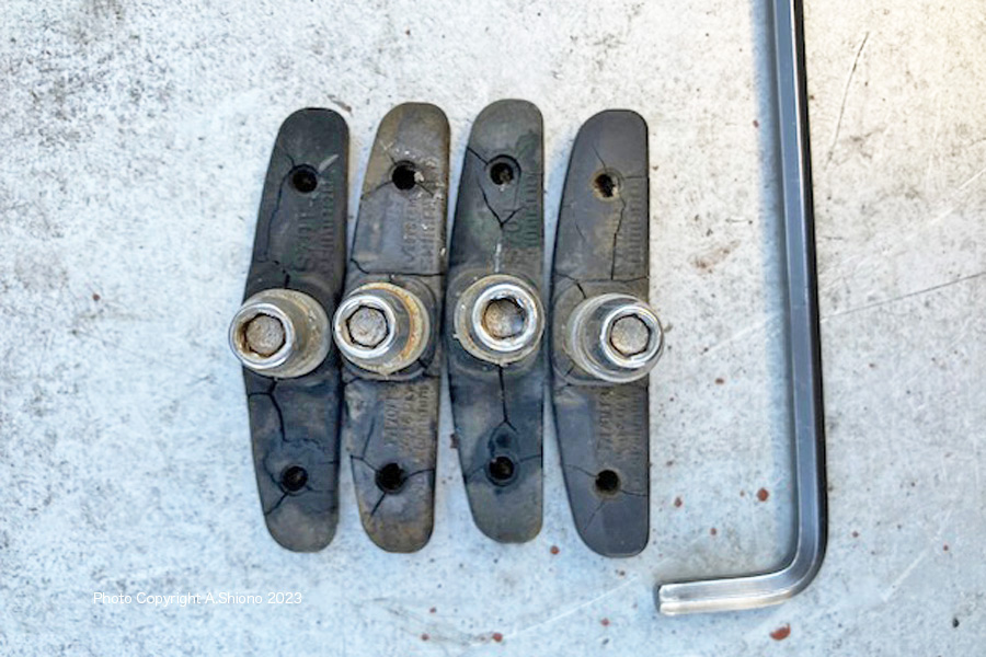 リア側の交換した左右のブレーキシュー 移 動: 制動時に高温になるブレーキシュー ヒビが入るVブレーキシューの素材 Vブレーキシューの交換 Vブレーキシュは首振りする ブレーキ関連用品 置き換え画像 工具セット ツールセット リンク: ブレーキシュー交換で、安全走行 ブレーキシューを削って細動アップ! ブレーキアームがグラグラ ブレーキワイヤー調整 ハブメンテ LEDライト チェーンホイール CC/BB保守 ワイヤー潤滑 ブレーキ交換 Vブレーキ交換 外装変速タイヤ交換 チェーン交換 ワイヤー交換 パンク修理 注 油 適正空気圧 リムの振れ取り スポーク修理 BBメンテ ペダルメンテ トップへ 修理部品と工具を見る