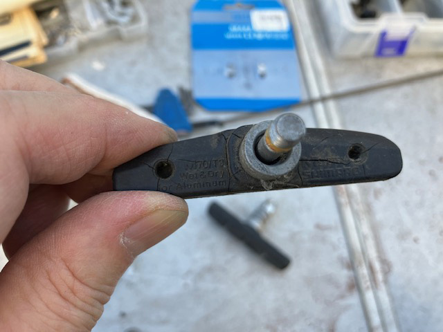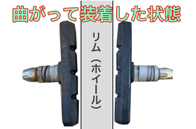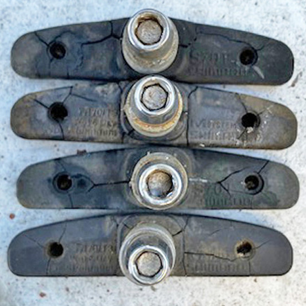 ペダルメンテ制動時に高温になるブレーキシュー トップへ ゴムのブレーキシューでリムを挟んで、摩擦で回転を止めるタイプのキャリパーブレーキや、カンチブレーキ、Vブレーキなどがあります。後輪がローラーブレーキなどのママチャリを除く、前後輪はゴムとリムの摩擦でタイヤの回転を止めるので、摺動面が高温に晒されます。制動時の高温〜冷却を繰り返して柔軟性があった素材も、長期間でプラスチックのようにカチカチになってきます。この状態だと摩擦係数が下がり、ブレーキレバーを握った割には止まってくれないようになってきます。
