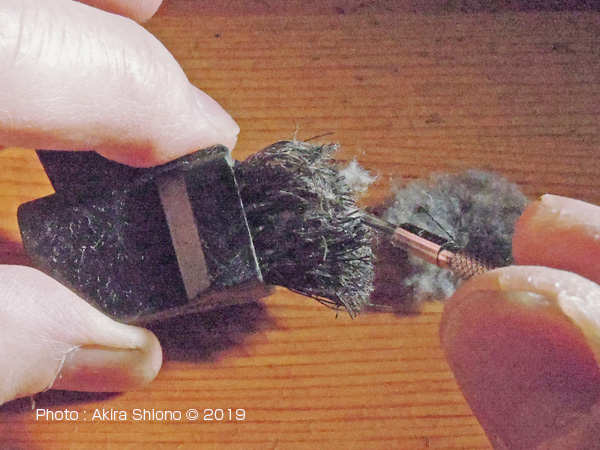 延長ブラシノズルのブラシ部分にこびり付いている棉ボコリを上部で先の細いもの(こちらではマイクロドライバーを使用)で髪をとく櫛入れの様にしてこそげ取ります。 熱湯と冷水で形を整えます トップへ