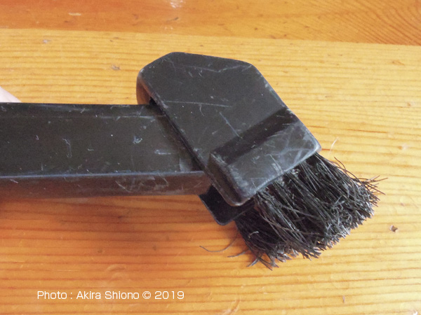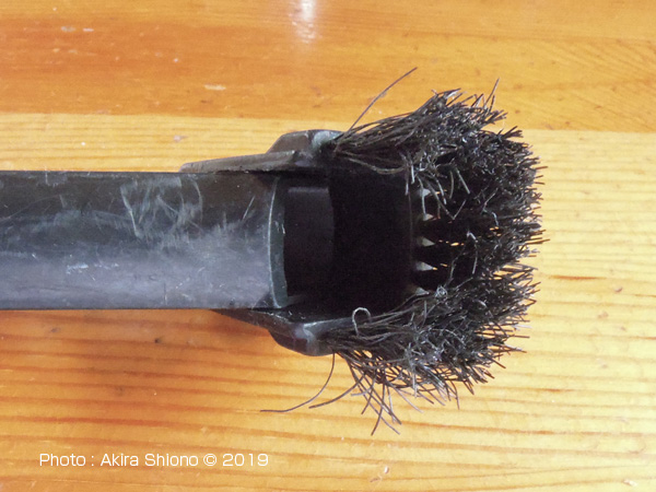掃除の際に、ブラシアタッチメントがあると細かい箇所とか、こびり付いたホコリをブラシ掛けしながら吸い取るのに非常に便利です。ここでは、延長ブラシノズルの機能を復活させるために、こびり付いてしまっている綿埃をこそげ取ります。ホコリがついたままですと、せっかくのブラシの掻き出し機能が無くなってしまうからです。このホコリを除去した後に開いてしまっているブラシの刷毛先を整えます 刷毛先が開いているブラシノズル トップへ