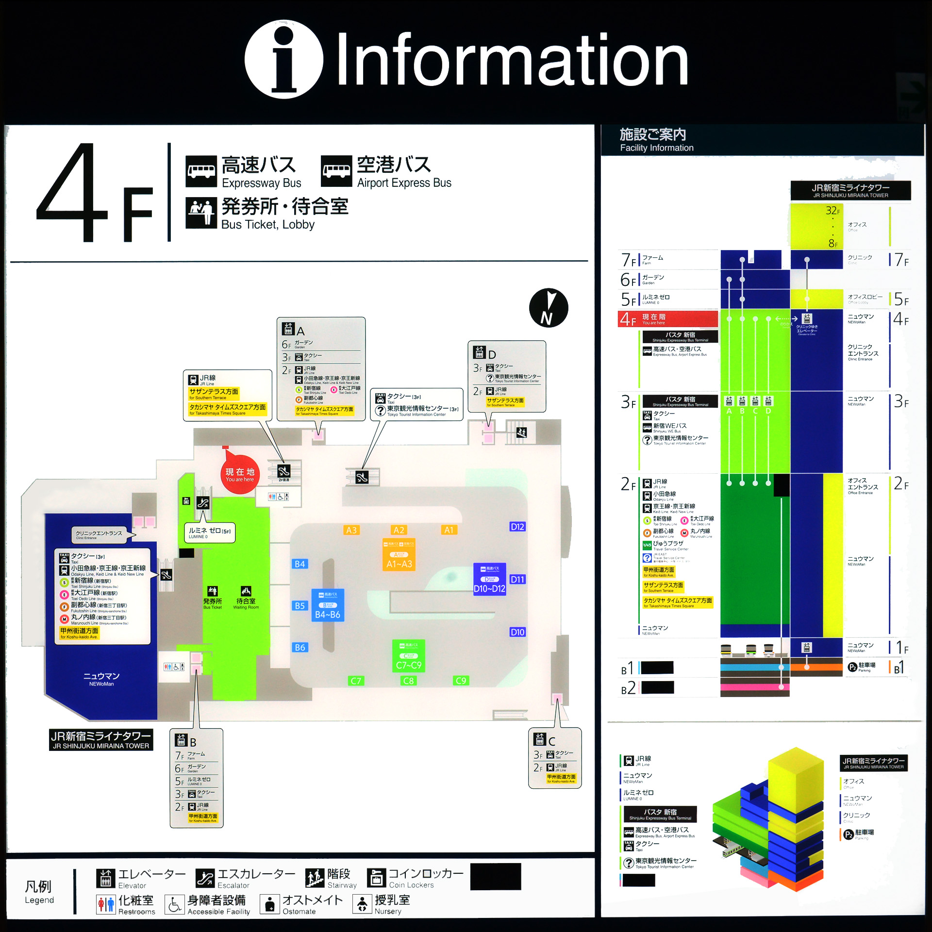 4階の長距離バスターミナル 移 動: 新宿駅南口の新しい顔 バスタ新宿フロアーマップ 工事中と完成後の風景 バスタ新宿 おしゃれになった新宿駅南端 4階の長距離バスターミナル リンク: 28階から新宿西口周辺 新宿御苑 南エリア 新宿御苑 北エリア 午後〜夕刻の新宿周辺 新宿駅南口のバスステーション;バスタ新宿 高い位置から見た新宿西口南方面 高い位置から見た新宿西口南方面 世界貿易センタービル 芝増上寺 東京タワー 浜離宮庭園 集約した長距離バスターミナル 4階 画像撮影日時;2016.6.19 トップへ 新しく出来たJR新宿駅新南口は大きく変わり、長距離バスステーションの「バスタ新宿」が併設されています。駅とバスターミナルが組合わさったことによって、シームレスに乗り換えが出来るようになりました。新宿駅新南口の甲州街道側の入口から入ると、1階はホームなので実際は2階になります。コの2階の改札を出ると、左側にこの2階から4階のバスターミナルまでの「直通のエスカレーター」が繋がっています。このおかげで毎階上りエスカレーターまで回らなくて済むため、大荷物の持っている方には とても楽に移動できます。 ![]() バスタ新宿の4階の配置図と各階の案内図クリックで拡大 ※1920x1920で見易く再掲載しました
