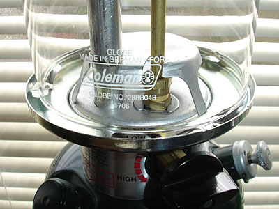 ここにある286は製造が1987年です。現在は286Aとして引き続き販売されているモデルです。この時代までポンプキャップはアルミ製でCリングで止められています。 マントル部分の上部にはタンク状の膨張室があり、ベンチレーターで隠れています。使い勝手向上のためにネジを外すだけで取手とベンチレーターが一緒に取れるので、マントルの交換がやり易くなっています。 カーラーの回りには取扱い説明文が英字で印字されてあります。火力調整ツマミは回し易いように長方形に出っ張っています。火力調整がわかり易いように強火の方向は太くなるようにデザインされています。グローブはMade in Germany製です。 ランタンの顔でもあるロゴは赤と黒の部分に金属フィルムの地色であるアルミ色で文字抜きされています。 下のランタンが2マントルタイプの288です。基本は286と一緒です。